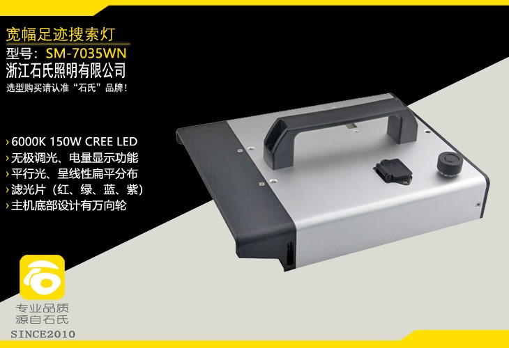 SM-7035WN寬幅足跡搜索燈底部設(shè)計有萬向輪,可根據(jù)需要移動燈具,方便一線人員作業(yè),同時具有極具人性化的無極調(diào)光和智能電量實時顯示功能,輕質(zhì)鋁合金殼體結(jié)構(gòu),體積小,重量輕,便于攜帶,廣泛適用于搜索潛在的指紋、足跡、血印、纖維等微量物證,特別針對刑事足跡搜索勘查。
