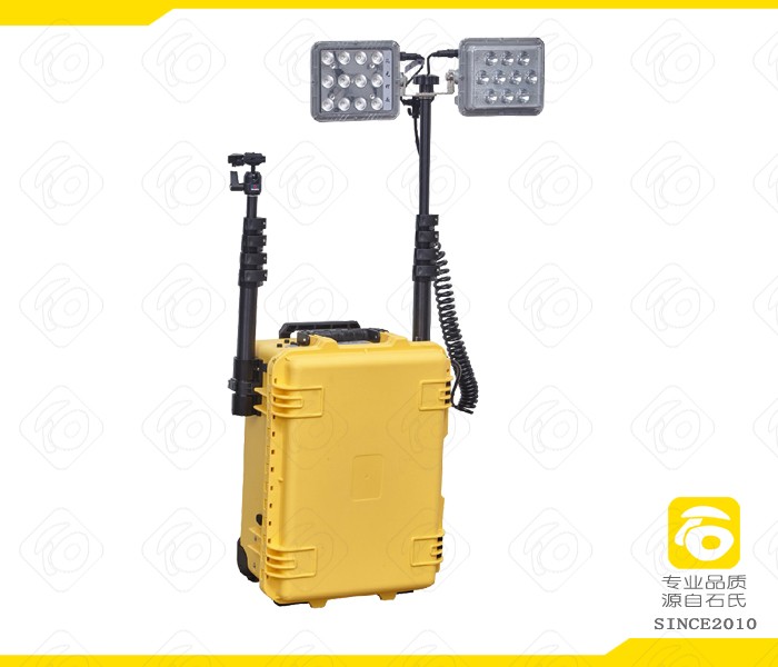 一、采用拉桿箱式設計,可手提、拉動,可以放在工作車輛的后備箱里攜帶??涩F(xiàn)場組裝拆卸,方便從一個現(xiàn)場快速移動到另一個現(xiàn)場。燈具升降桿采用扳手卡扣固定及限位,連接線頭設計貼有明確標識且設計有防呆結構,整體燈具裝卸快捷方便。